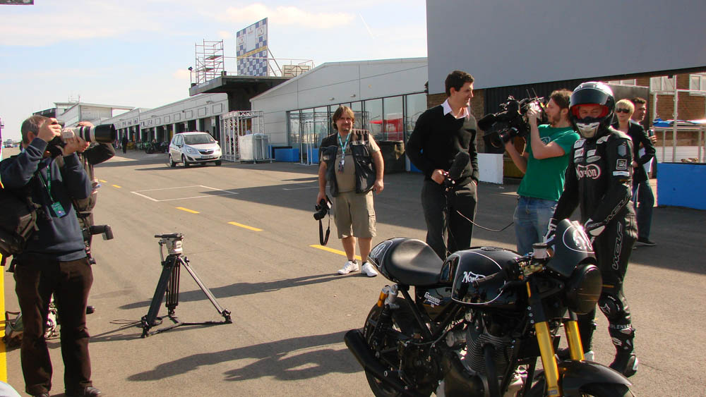 Chris et Norton aidaient à aider le réseau de télévision BBC avec leur accumulation à la fête mondiale de week-end SBK. Equitation Norton modèle spécial signature Panther, Stalker rodée au rythme autour du circuit Grand Prix 2.498 mile avec un équipement caméra embarquée, ce qui aidera à fournir l'auditoire avec un petit goût de ce que ce sera comme pour effectuer un tour du circuit.